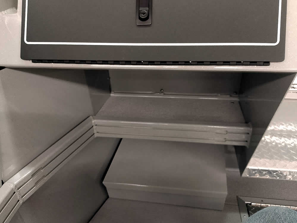 - Storage shelf under both consoles